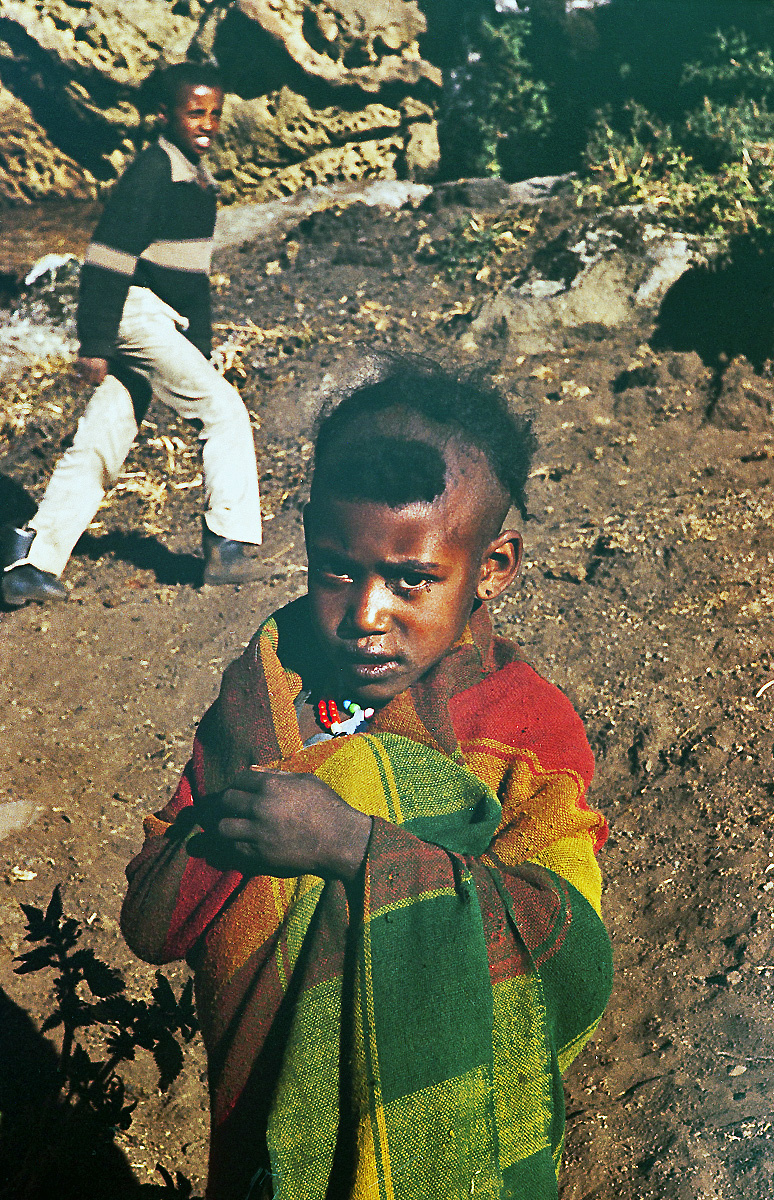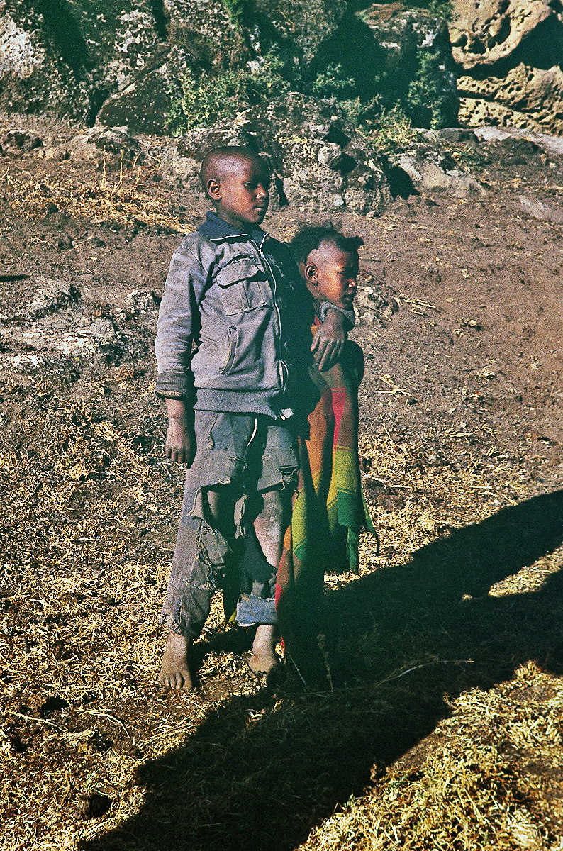 V ústrety nám přišly tyhle dvě děti. Všimněte si, že jsou bosé a jejich oblečení je více než ubohé. To hnědé pod jejich nohami jsme poznali až po notné chvíli. Byly to suché oslí výkaly a mocnost této hmoty dosahovala do výšky asi jednoho metru.