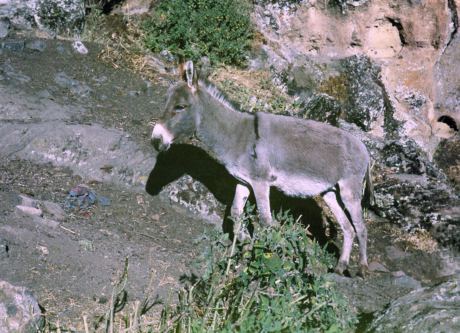 Jdeme dolů. Cestou jsme narazili na osla "kamzičnatého", který obratně šplhal po příkrém srázu. Toto zvíře bylo důležitým prvkem v životě skalní komunity, ale stejně by mě zajímalo, kde měli ti lidé tato svá zvířata ustájená. Že by nějaká maštal byla v hlubinách skály ?