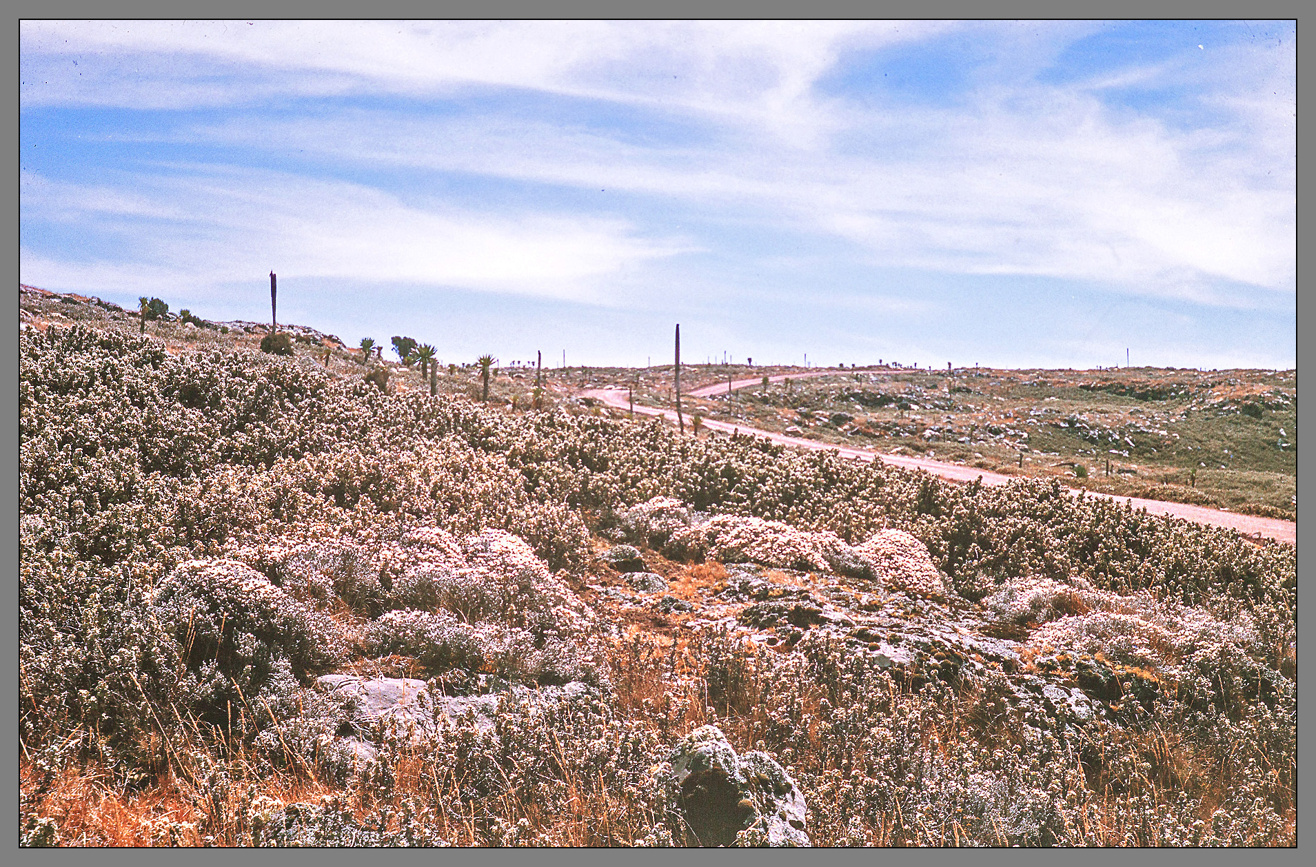 Stromy zmizely a podél cesty jsme mohli vidět tuto velehorskou krajinu s nízkými i polo vysokými keři. Zpestřením byly malé palmy, dosahující výšky asi jeden metr.