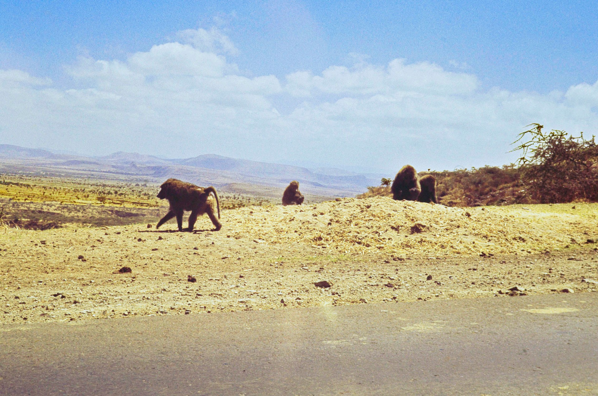 Tak tady už bylo zřejmé, že jsme skutečně v té správné Africe. Tyto opice jsou, jak je všeobecně známo, velice inteligentní. Takže číhaly na projíždějící auta a žebrali něco k snědku. Jsou však ve skupinách velmi nebezpečné a tak jsme vůbec netoužili aby nám předvedli co dovedou a jenom jsme kolem nich projeli.